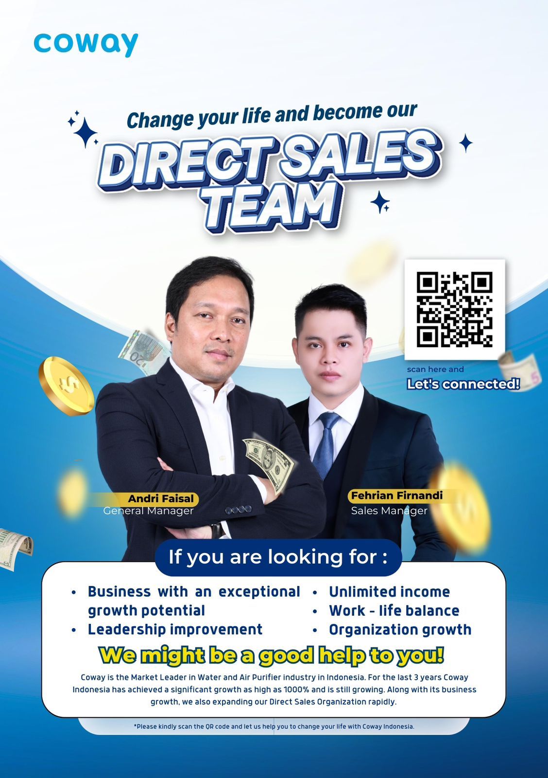 Coway is the Market Leader in Water and Air Purified industry in Indonesia. For the last 3 years Coway Indonesia has achieved a significant Growth as high as 1000% and is still Growing. Along with it's bussiness Growth, we also expanding our Direct Sales Organization rapidly